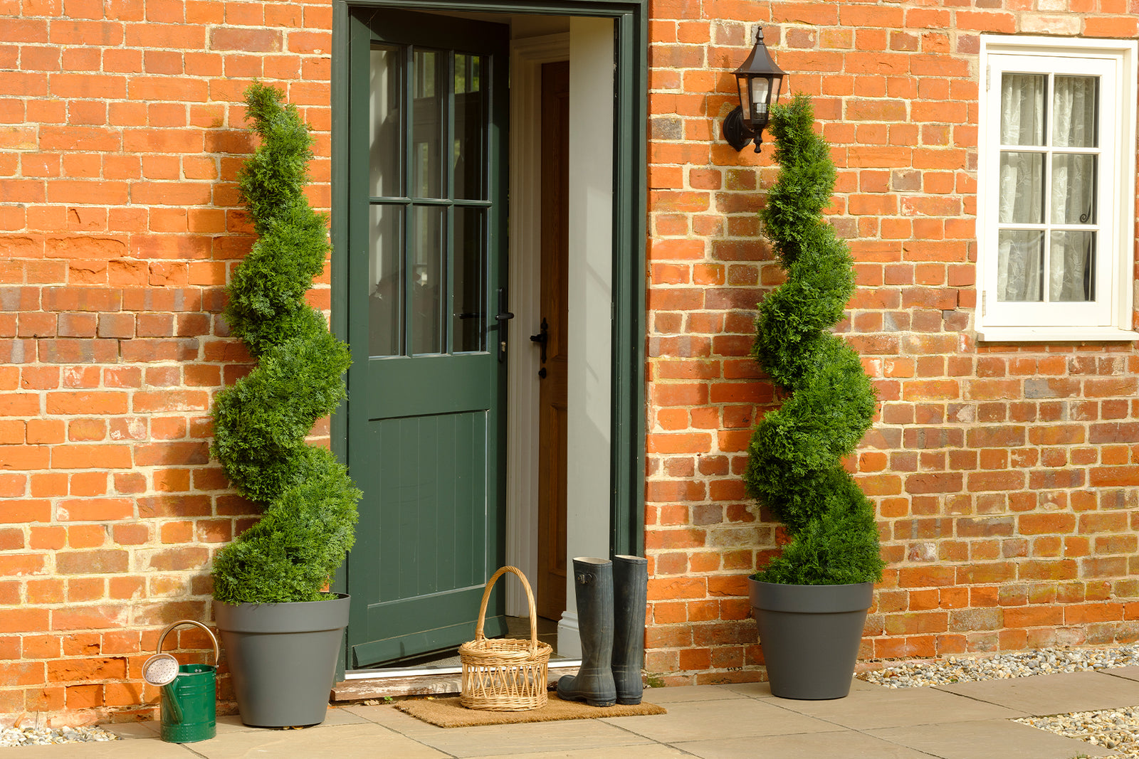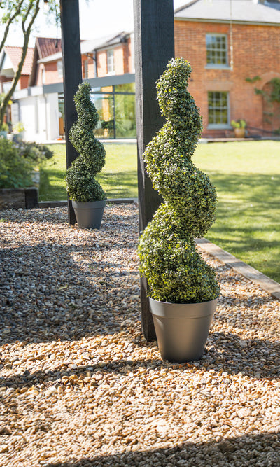 Don’t forget about the outside of your premises. Spiral topiary trees offer a stunning way to frame the entrance to the building or car park. You can also add instant low maintenance colour with artificial window boxes and hanging baskets.