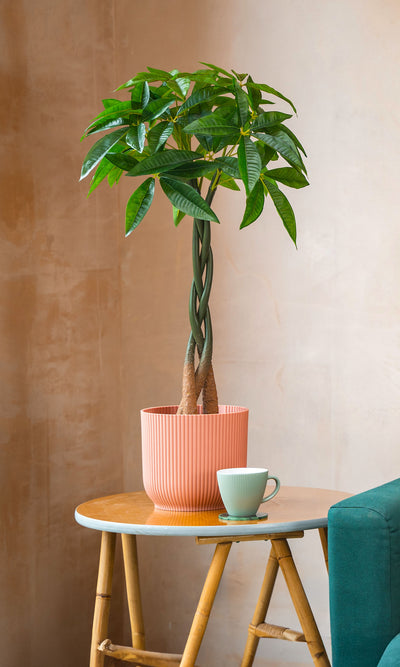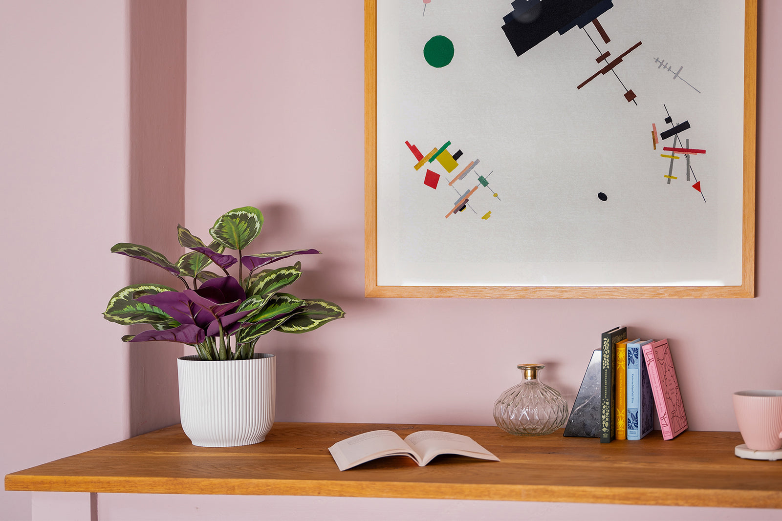 Potted plant on a wooden side table against a pink wall with a sofa and cushions.Artificial potted tree with green leaves on a white background