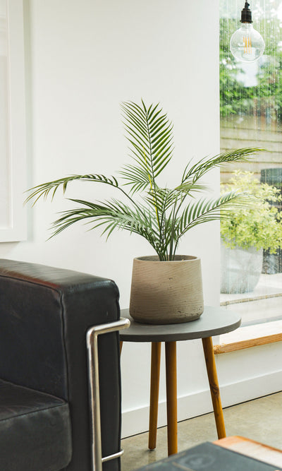 Potted plant next to a brown sofa with a blue pillow against a beige wall.Potted artificial palm plant on a white background