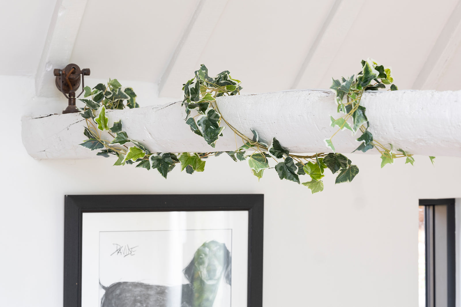 White wooden beam with green ivy plants against a white wall.Artificial ivy vine on a white background
