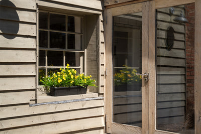 We use a black 60cm long black window trough. It’s made from high-grade plastic making it durable, lightweight, and UV stable. We add ballast to give the window box some weight and a low centre of gravity which stops it from toppling over in the wind.