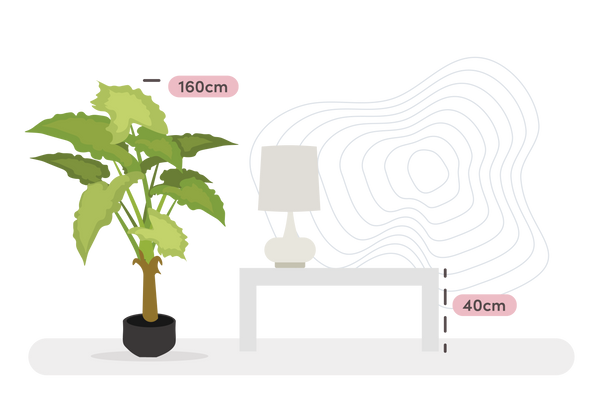 Measuring approximately 160cm tall and 130cm wide, our artificial alocasia macrorrihizos has nine thick green stems, sprouting from a stocky trunk. The main stem is decorated to replicate where older stems would have naturally sprouted before dropping off, which gives this faux plant and far more realistic look than most on the market.