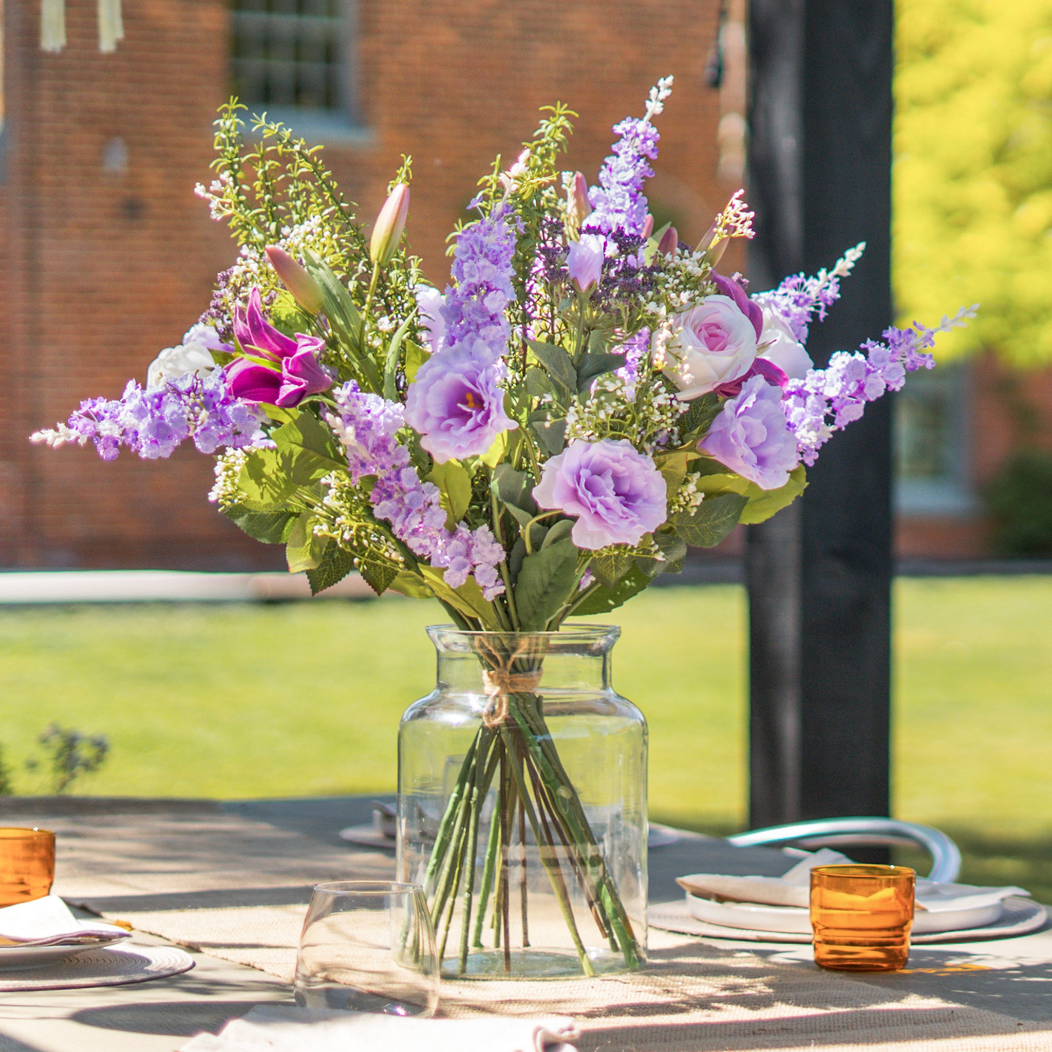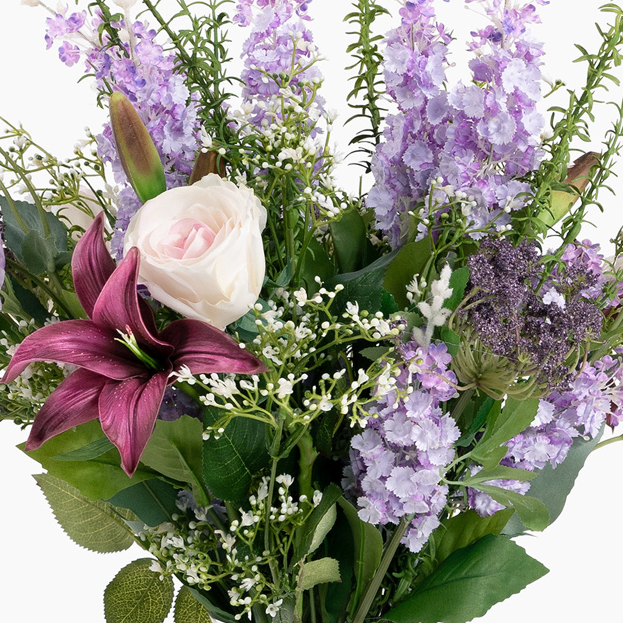 Inspired by the crystal of the same name, known for its tranquil properties, our faux amethyst bouquet includes calming lilacs and peaceful pink and white roses, alongside rosemary for remembrance, cow parsley, stock sprays, gypsophila and lisianthus, bringing all the beauty of nature into your space.