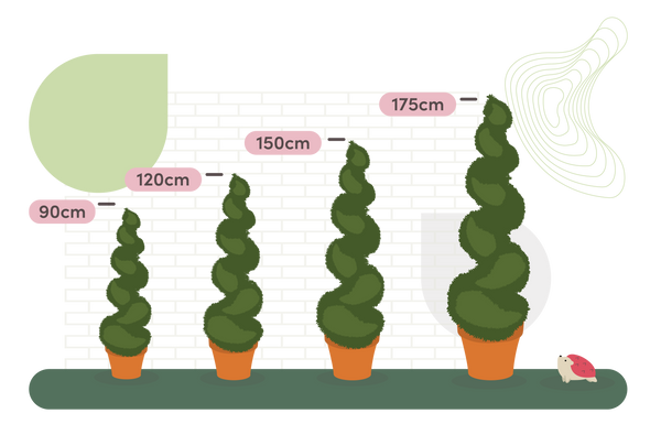 Available in four sizes from 90cm (3ft) to 175cm (about 6ft) , we're bound to have the right size tree for you. The best part is that unlike the real thing, our faux cedar spiral will never grow out of shape!