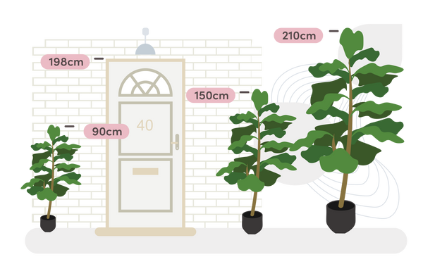 The artificial ficus lyrata tree is available in three sizes, from 90cm (3ft) all the way up to 210cm tall (about 7ft). All measurements are taken from the ground to the top of the plant. You can raise the height by popping it in a pre-filled taller pot.