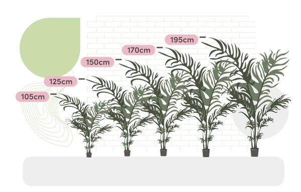 Available in four sizes, from 105cm (3.5ft) all the way up to 195cm (6.5ft) to suit every space. All measurements are taken from the floor to the top of the plant. You can raise the overall height by popping the palm in a pre-filled taller pot or a plant stand.