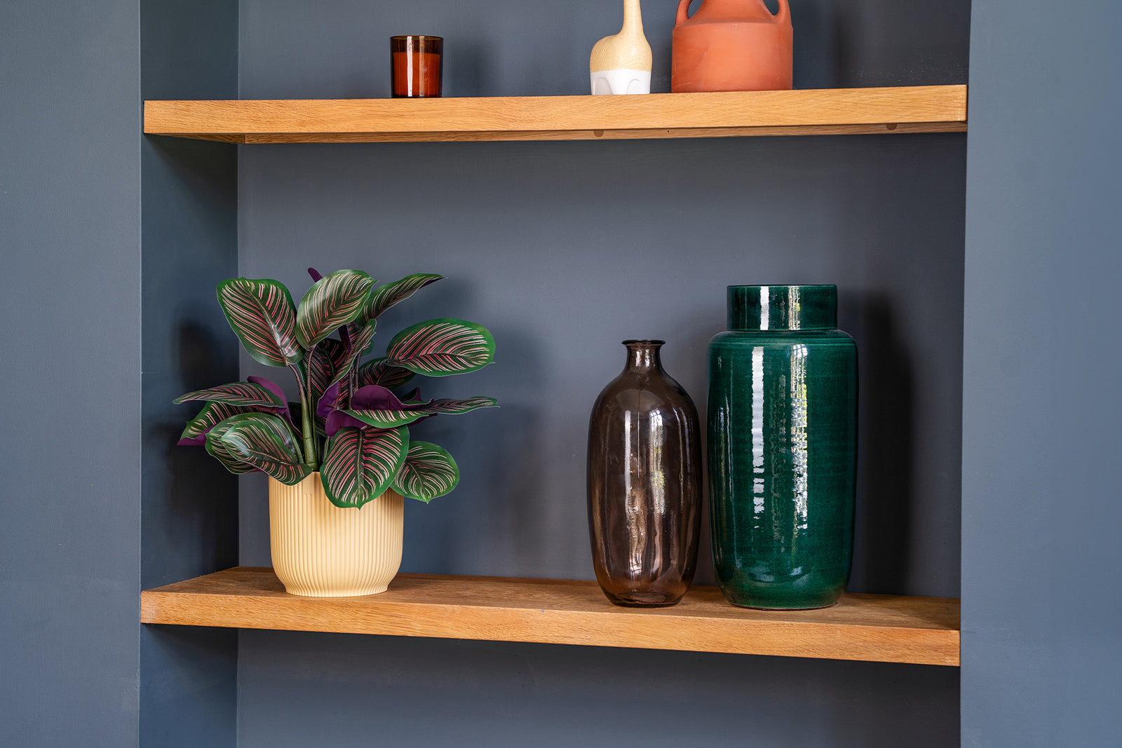Our faux pinstripe calathea measures 40cm (H) x 35cm (W), making it the perfect plant for shelves, worktop spaces or small side tables.