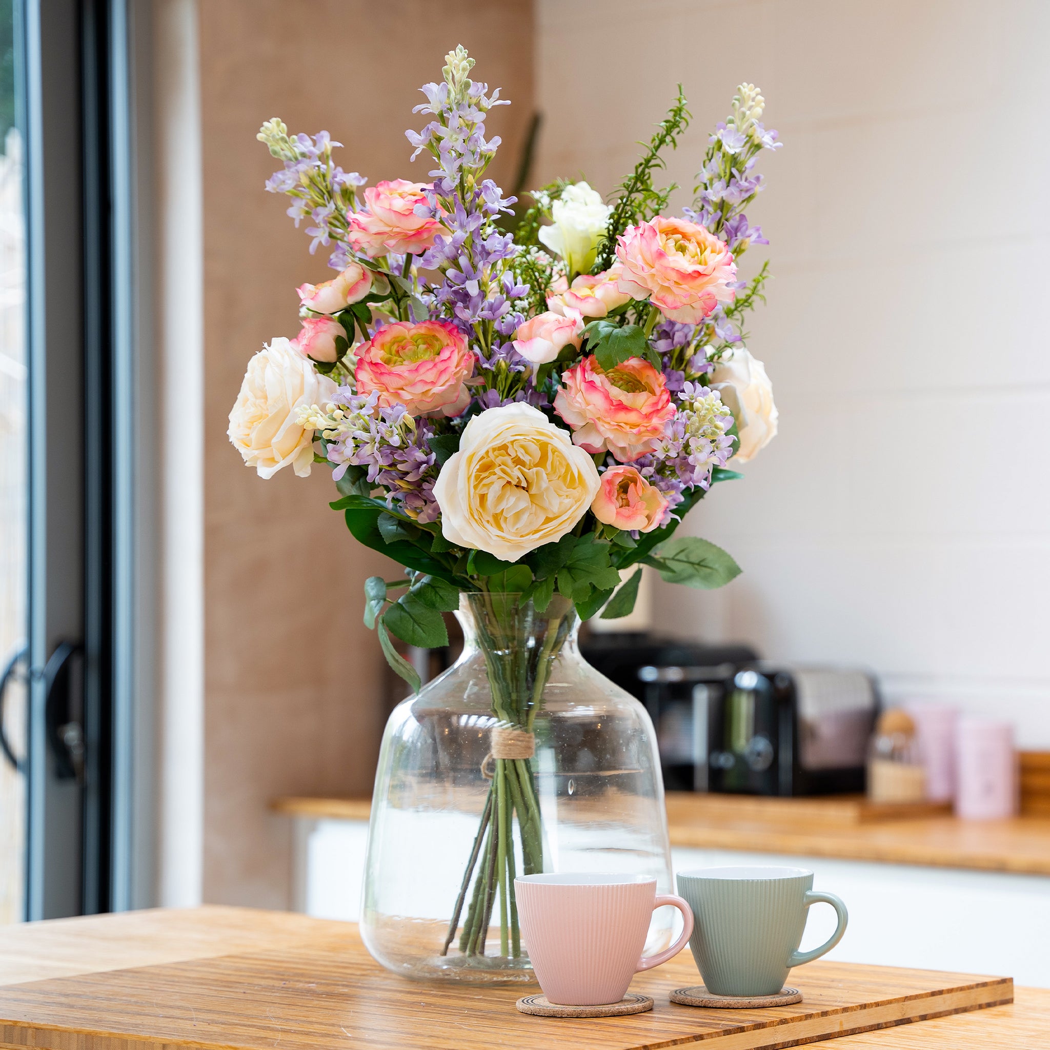 Our artificial pretty pastels bouquet is approx 65cm tall. Using some wire cutters, you can easily trim down the height of this bouquet to suit any vase.
