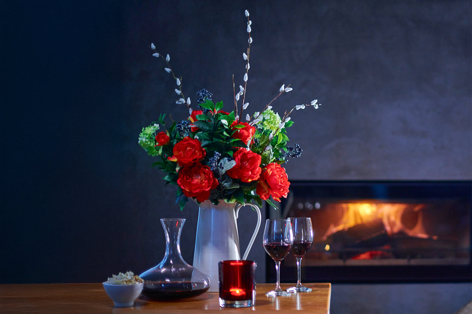 Bright red artificial peony stems have been crafted using high quality materials so they look amazingly lifelike. These are perfectly arranged by our florists with individually selected stems of pussy willow, bay, viburnum, and burry sprays, all hand-tied to create a striking piece for a lasting look.