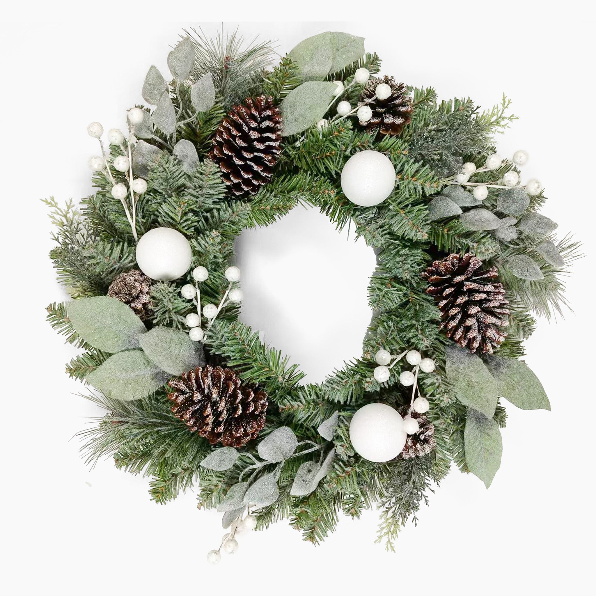 At a generous 60cm across, our artificial frosted forest wreath doesn't hold back on festive drama! Frosted greenery winds through clusters of white winter berries, rustic pine cones, and glimmering white baubles, giving you a festive look that's both cosy and magical.